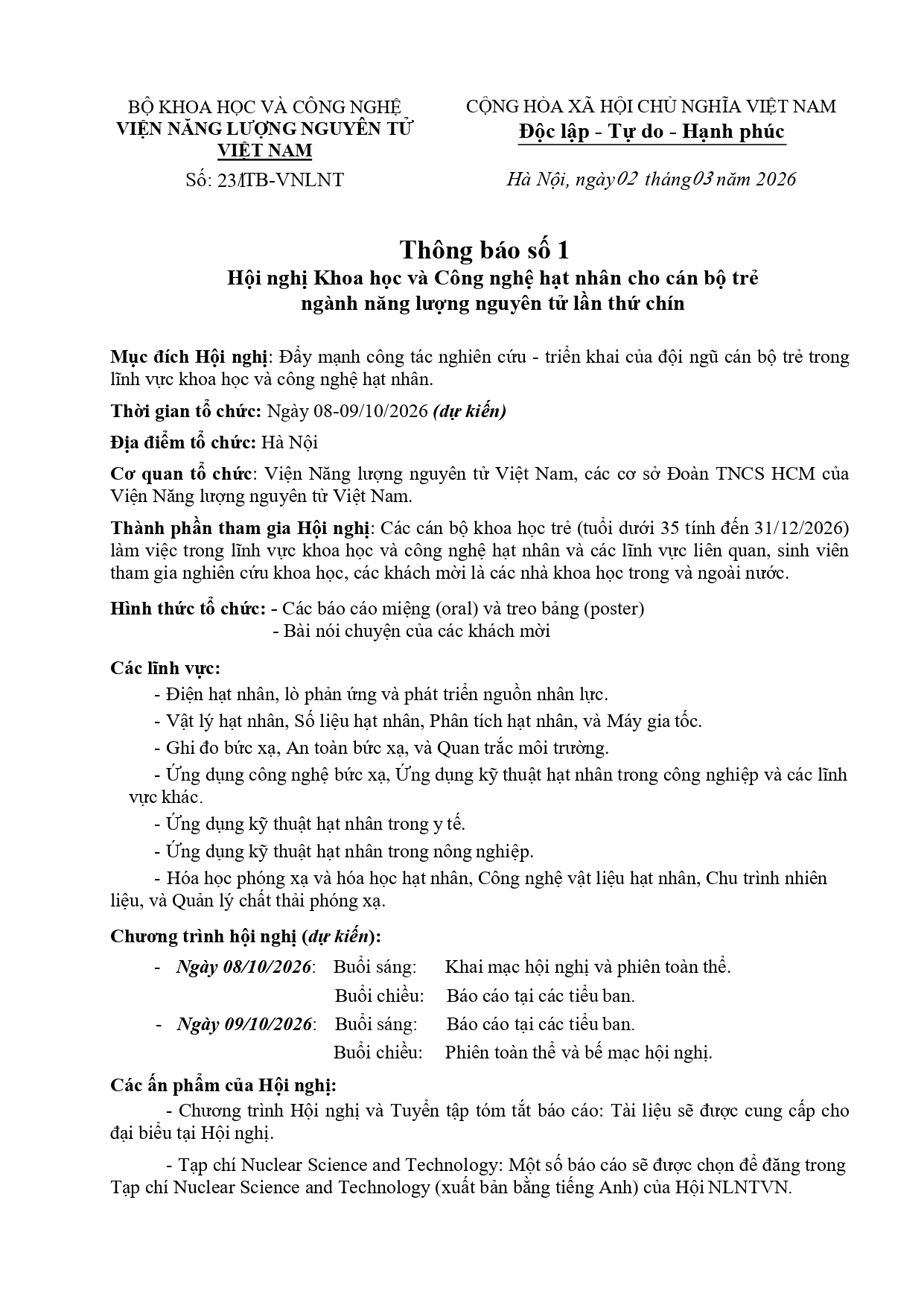 Thông báo số 1: Hội nghị Khoa học và Công nghệ hạt nhân cho cán bộ trẻ ngành năng lượng nguyên tử lần thứ chín